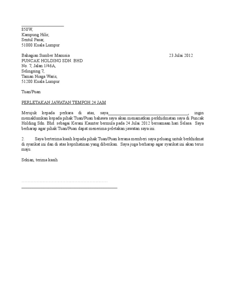 Contoh Surat Rasmi Berhenti Kerja 24 Jam Kumpulan Contoh Surat Dan Soal Terlengkap from contoh123.com Contoh surat berhenti kerja notis. 82% (45) 82% found this document useful (45 votes) 434k views 1 page. Berikut ialah contoh surat berhenti kerja kerana telah mendapat tawaran di tempat lain, dengan notis sebulan atau 30 hari. Seperkara lagi, tak perlu terlalu rumit. Feb 26, 2020 · artikel kali ini akan berkongsi tentang contoh surat berhenti kerja. Dinasihatkan agar semak semula surat tawaran kerja terlebih dahulu, adalah notis sebulan dibenarkan. Jul 09, 2012 · cuti rehat pegawai yang berhenti kerja pegawai yang akan meninggalkan perkhidmatan kerajaan, hanya layak mengambil cr bagi perkhidmatan yang melayakkan sebelum tarikh beliau meninggalkan perkhidmatan kerajaan p. Am 9(b) bab c16.06.09 22 23.